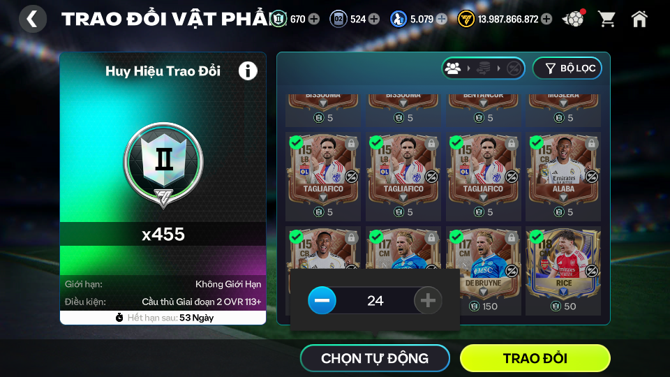 #10093 - ĐH 134B OVR 124 8 CON 117 + 6 CON 116 - Garena SĐT chờ Đổi